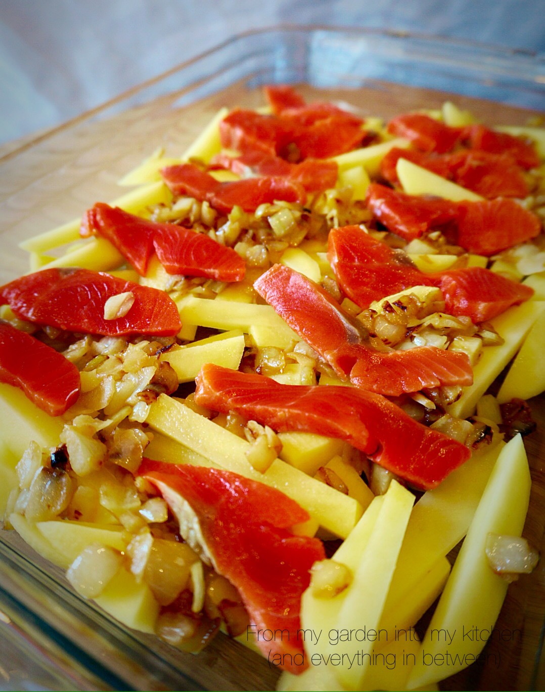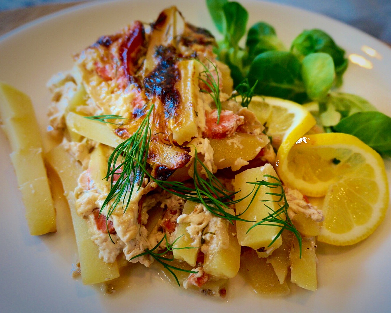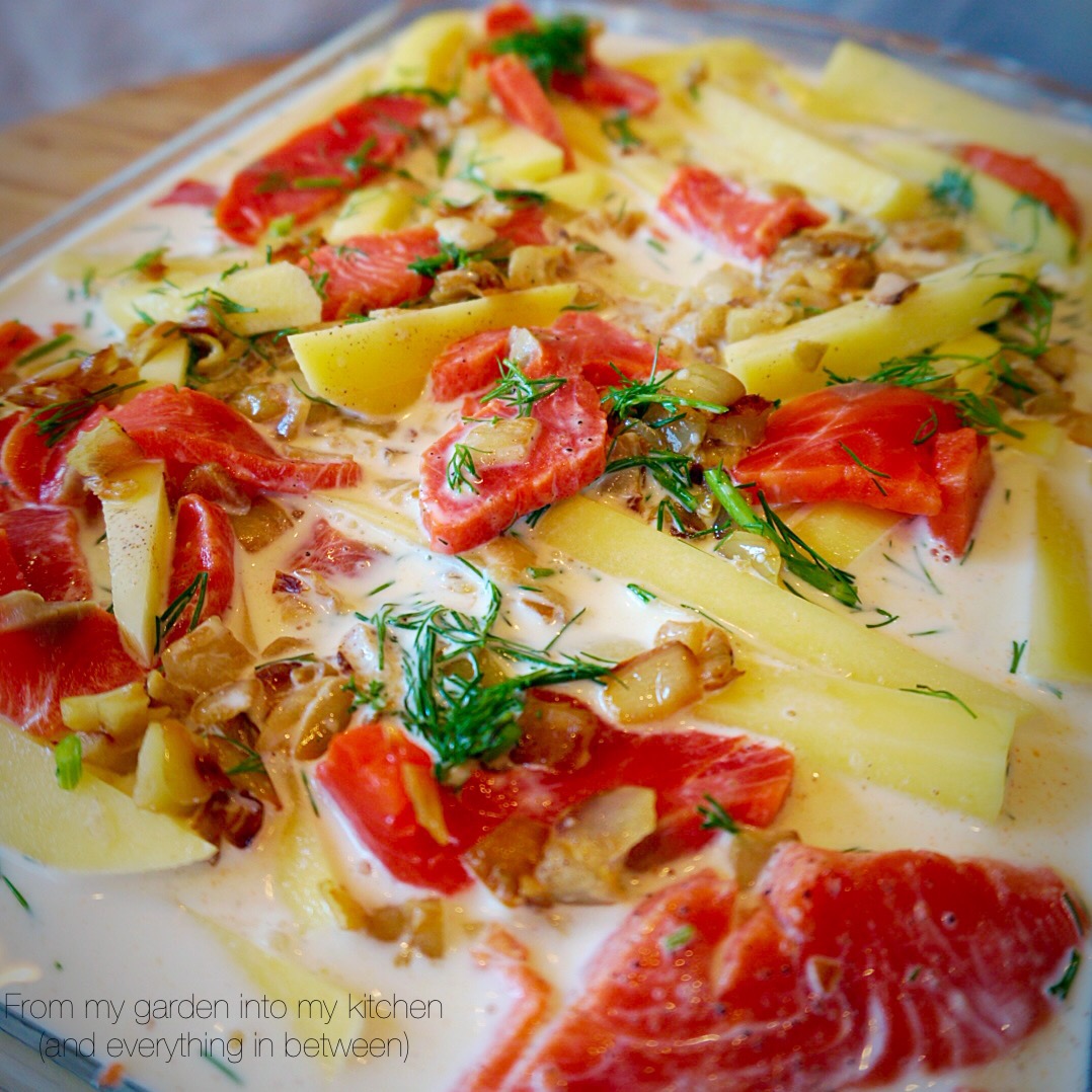 It is potato and salmon casserole. Very simple and fast food to cook. Only thing you have to really take care of are the potatoes. I have had several time issues with them while cooking this. Some potatoes take awfully long time to cook trough. Take care that potato which you use is soft boiling type,meant for the mashed potatoes.