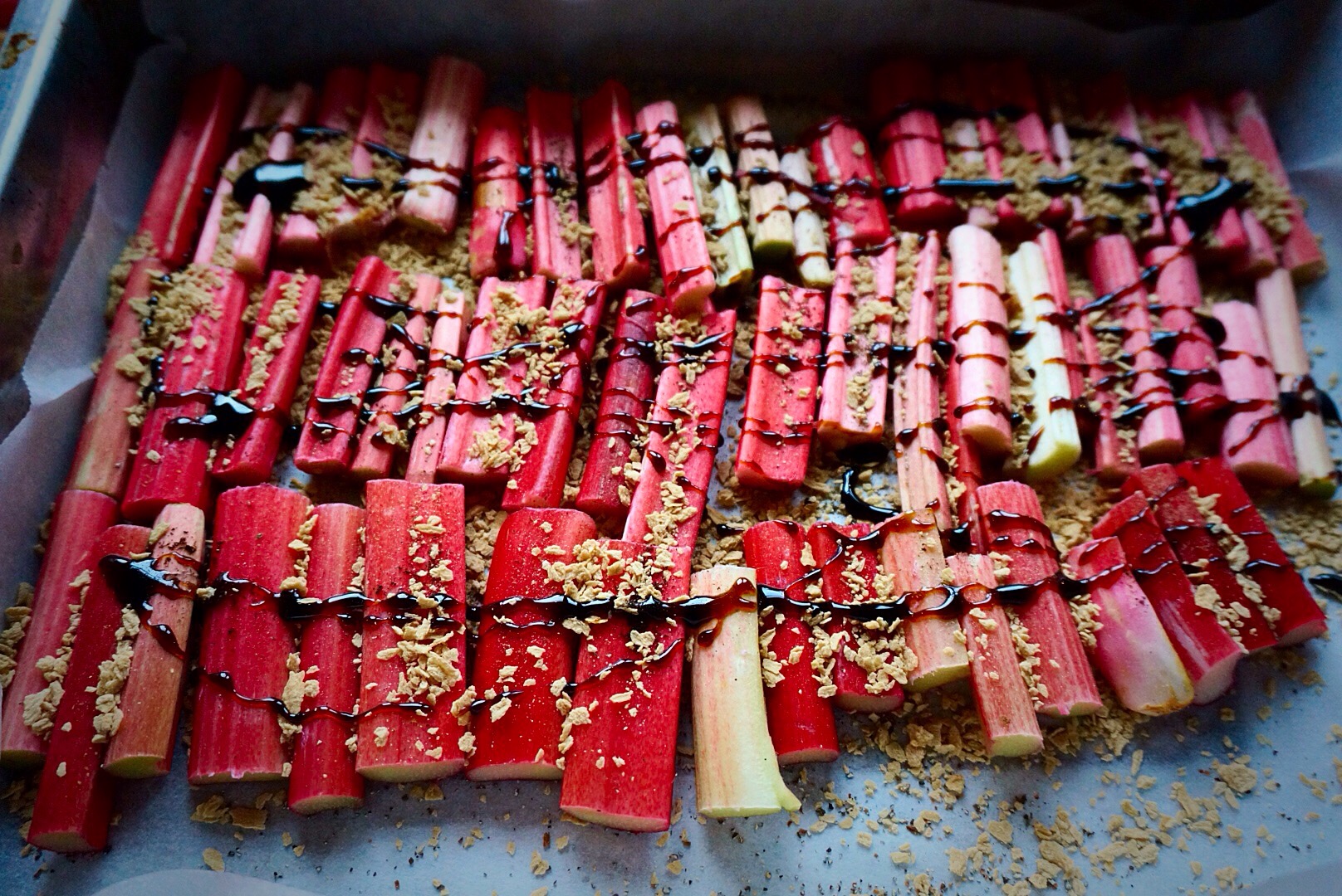 - Heat oven to 200C. Rinse the rhubarb and shake off the excess water. Trim the ends and cut the rhubarb into little finger-sized pieces. Put the rhubarb in a shallow dish or baking sheet with sides, tip the sugar over, toss together, then shuffle the rhubarb so it’s in a single layer.Sprinkle all spices over rhubarb.