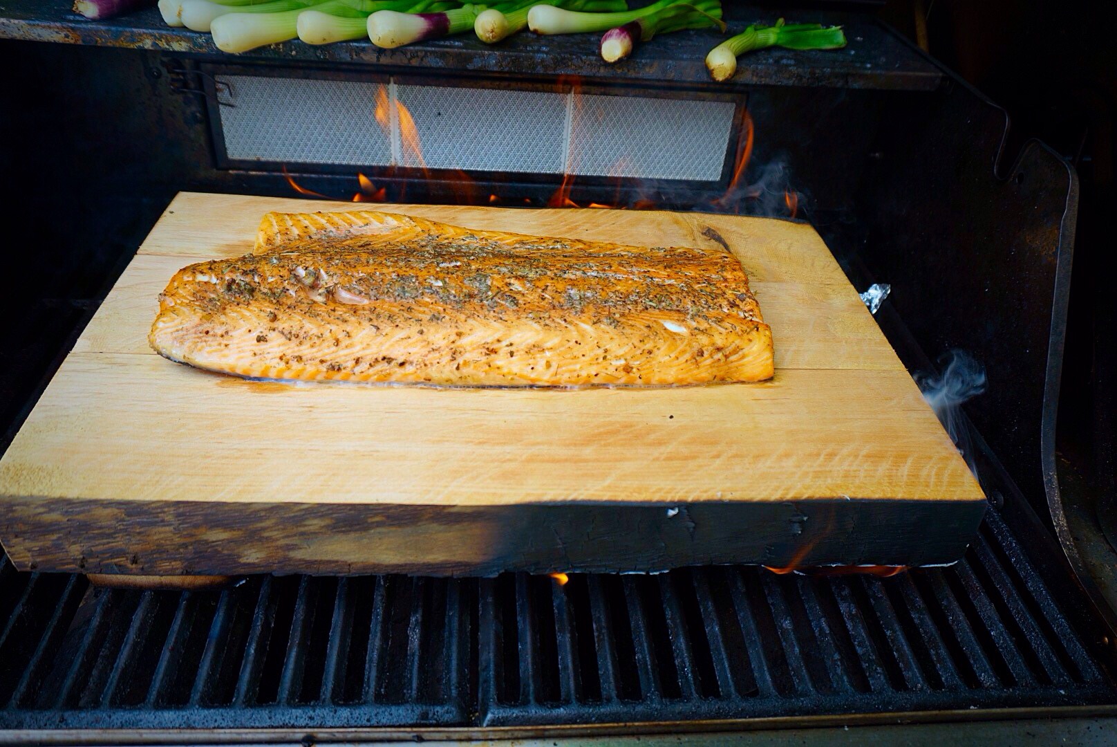 I tried flaming already once, in the grill, with small piece of salmon.The cedar blank, which I used, was too thin and started to burn quite fast.With the small piece of the salmon,it really didn’t matter, because it was cooked fast.