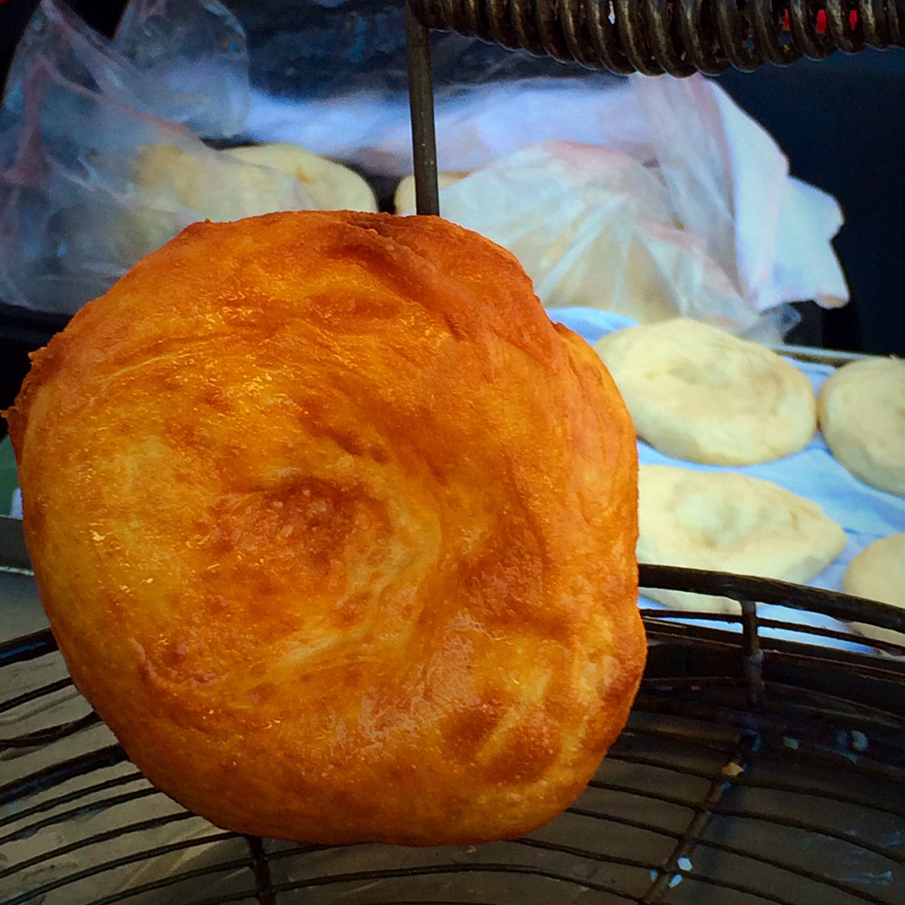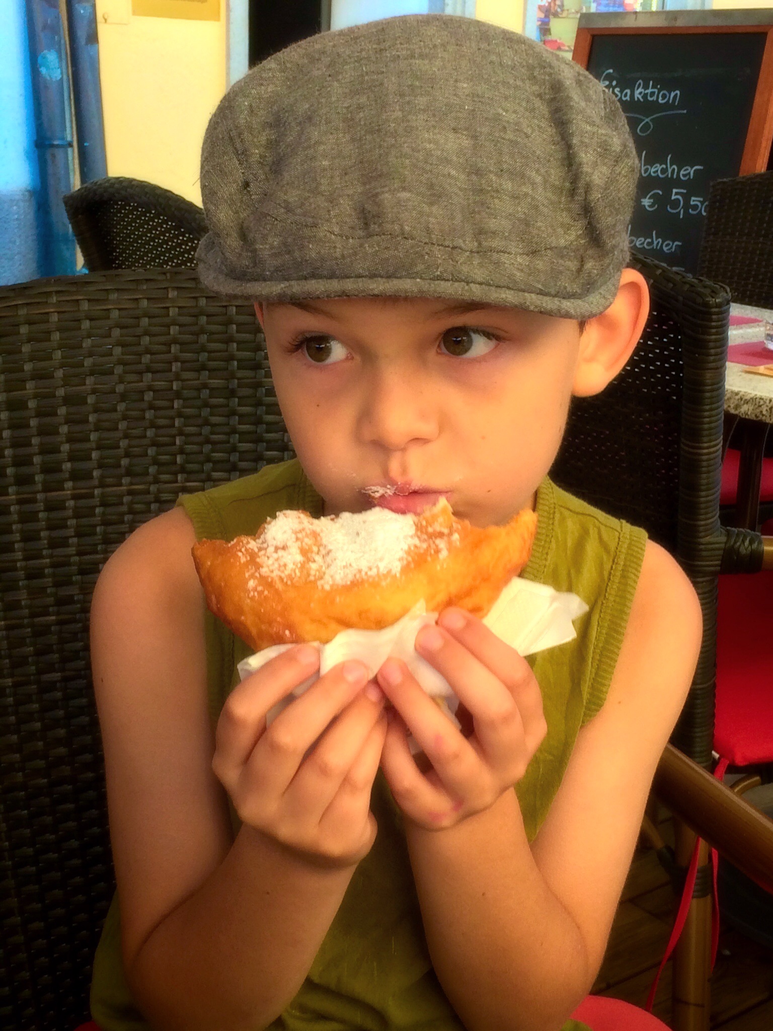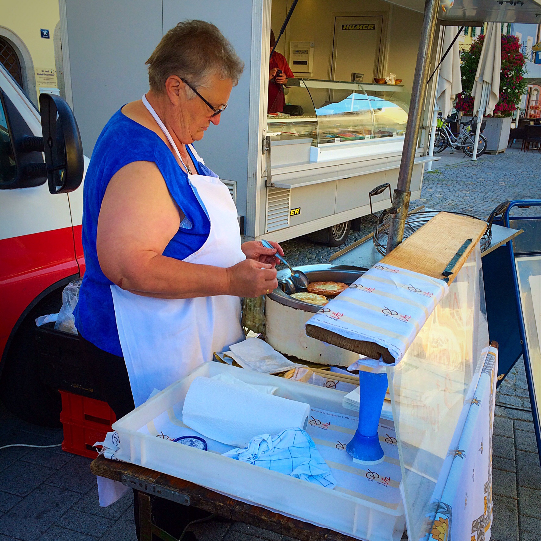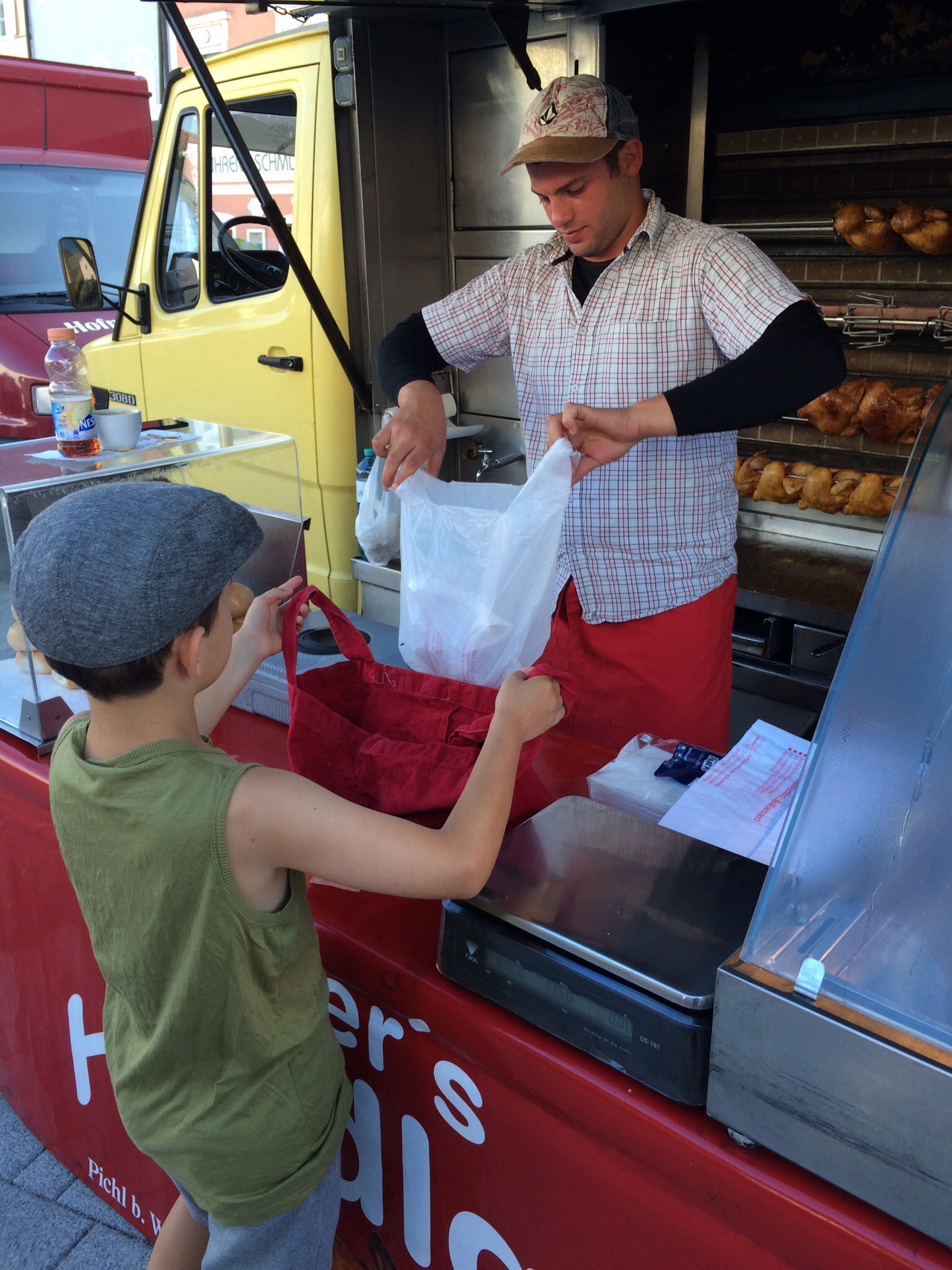 Kiddo wanted to have “Bauern Krapfen” as breakfast. Krapfen is bit like donut but it is not filled at all and it is eaten with powdered sugar. Luckily we have lady who makes them in market.
