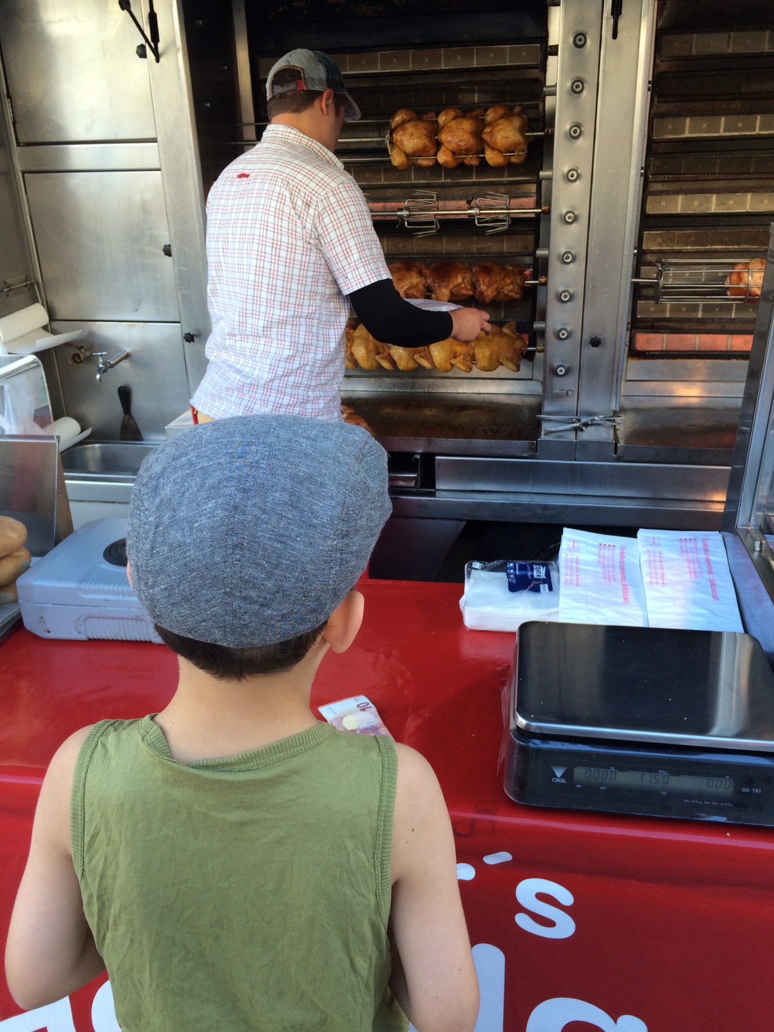Kiddo is like his granddad.Anything grilled goes! He loves grilled chicken.So we bought one whole chicken for us as lunch. No need for me to cook anything else, just make salad with the chicken. Perfect! Anyway today has been so hot that the chicken was really perfect choice for meal. I like to make Kiddo work little, while we are shopping together.I give him money and tell him to go and get what we need.It makes him feel himself important, and builds bit character.