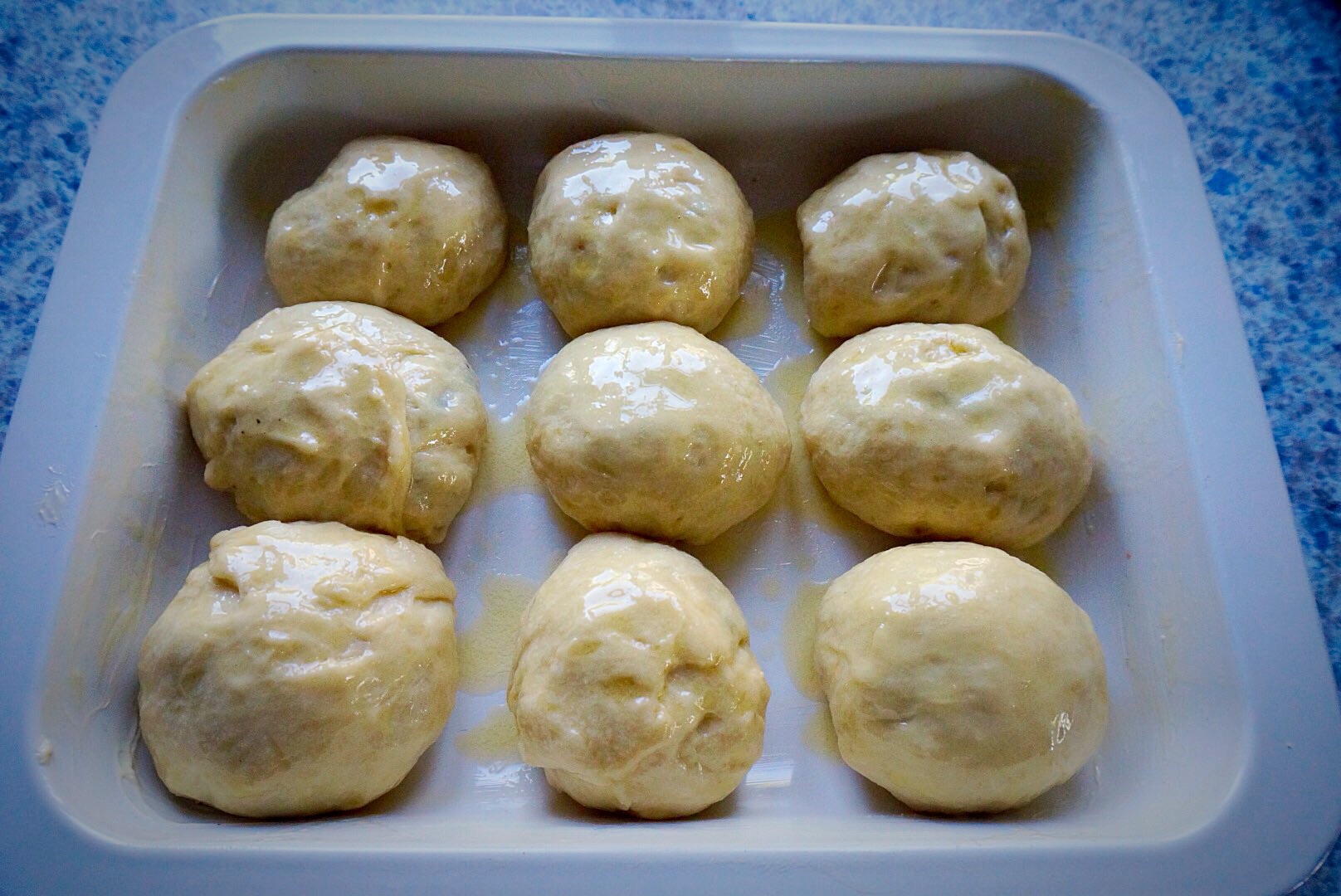 Put about 2 ½ tablespoons melted butter (you might need a little more) in a small bowl. Brush a baking pan with melted butter, just until coated. Brush each bun when you’ve placed them in the pan.