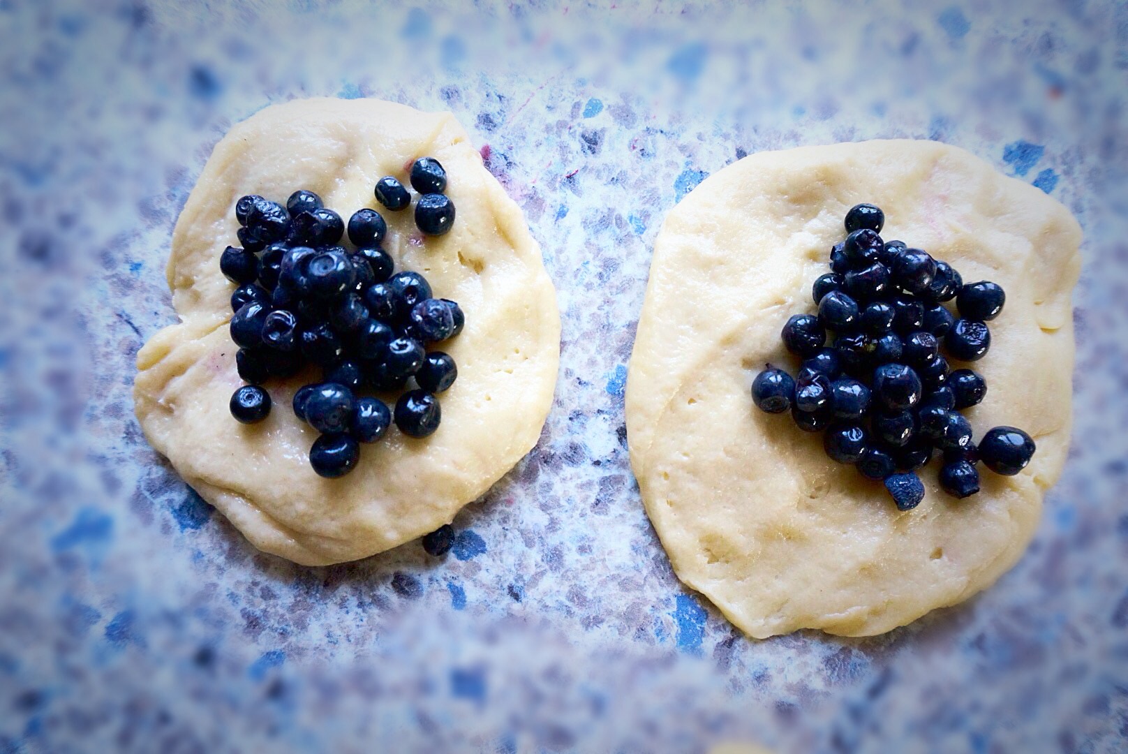 Put 1 tablespoon of bilberries (or apricot jam),not more, in the center of every circle. Wrap the dough around the filling, pinching and sealing it tightly. Round the buns again, creating a bit of surface tension. If you use too much filling, it’s difficult to seal them. Also avoid getting jam onto your edges, because this way it is almost impossible to seal them.