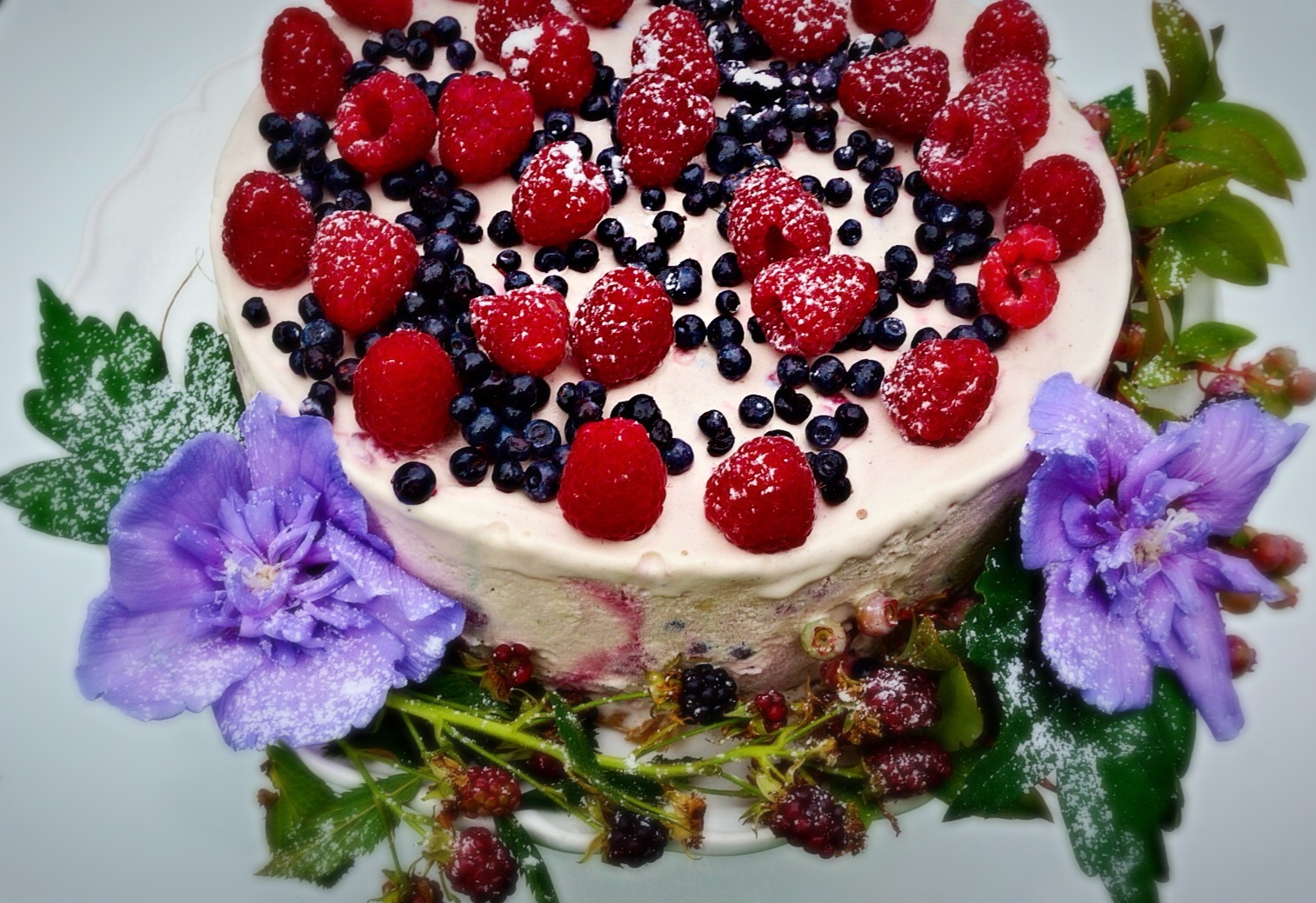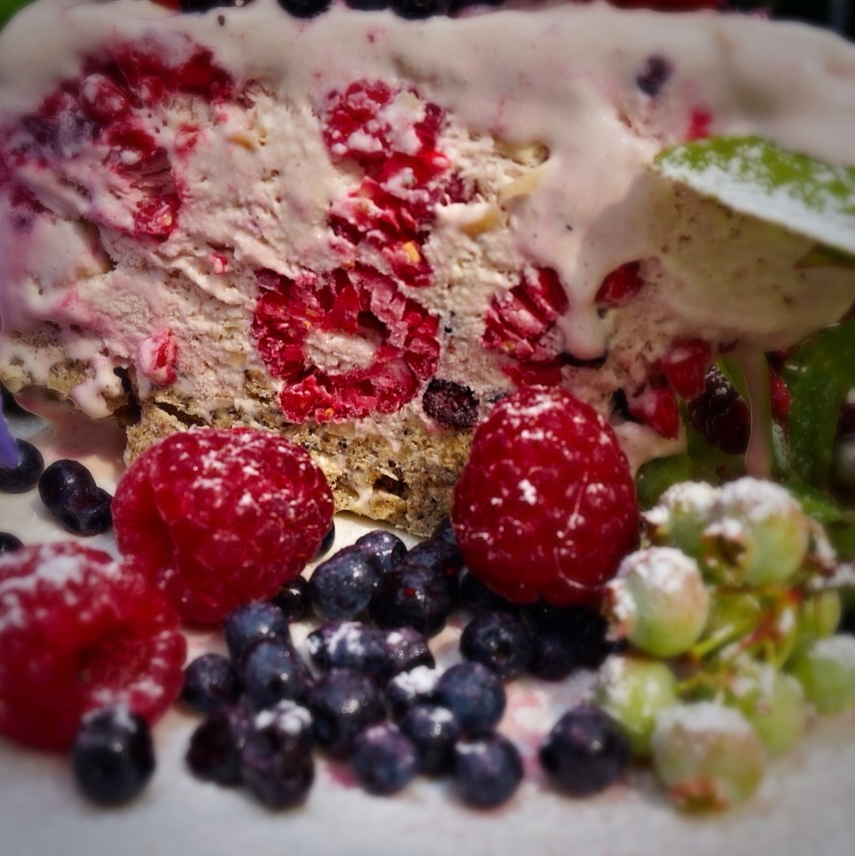 Cut and garnish with reserved raspberries and blueberries.