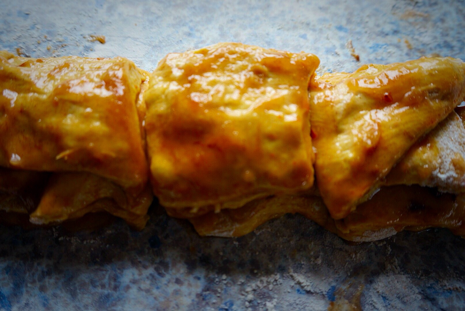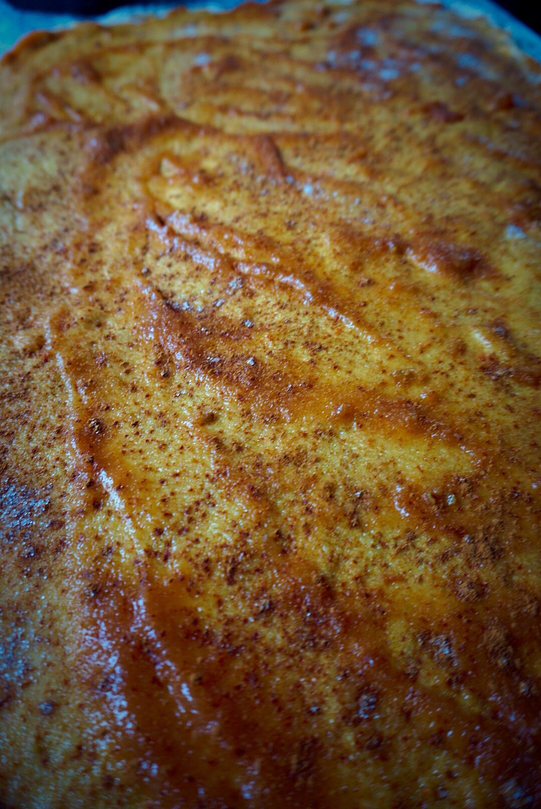 Once dough has doubled in size, punch it down and flop out onto a clean floured surface. Knead with hands for 1-2 minutes. Roll dough into a rectangle. Brush dough with apple puree. Sprinkle with sugar and cinnamon.
