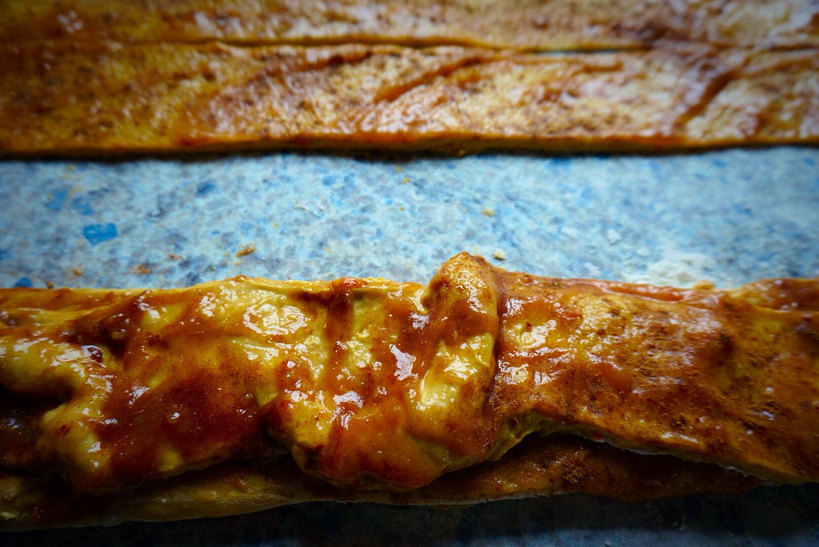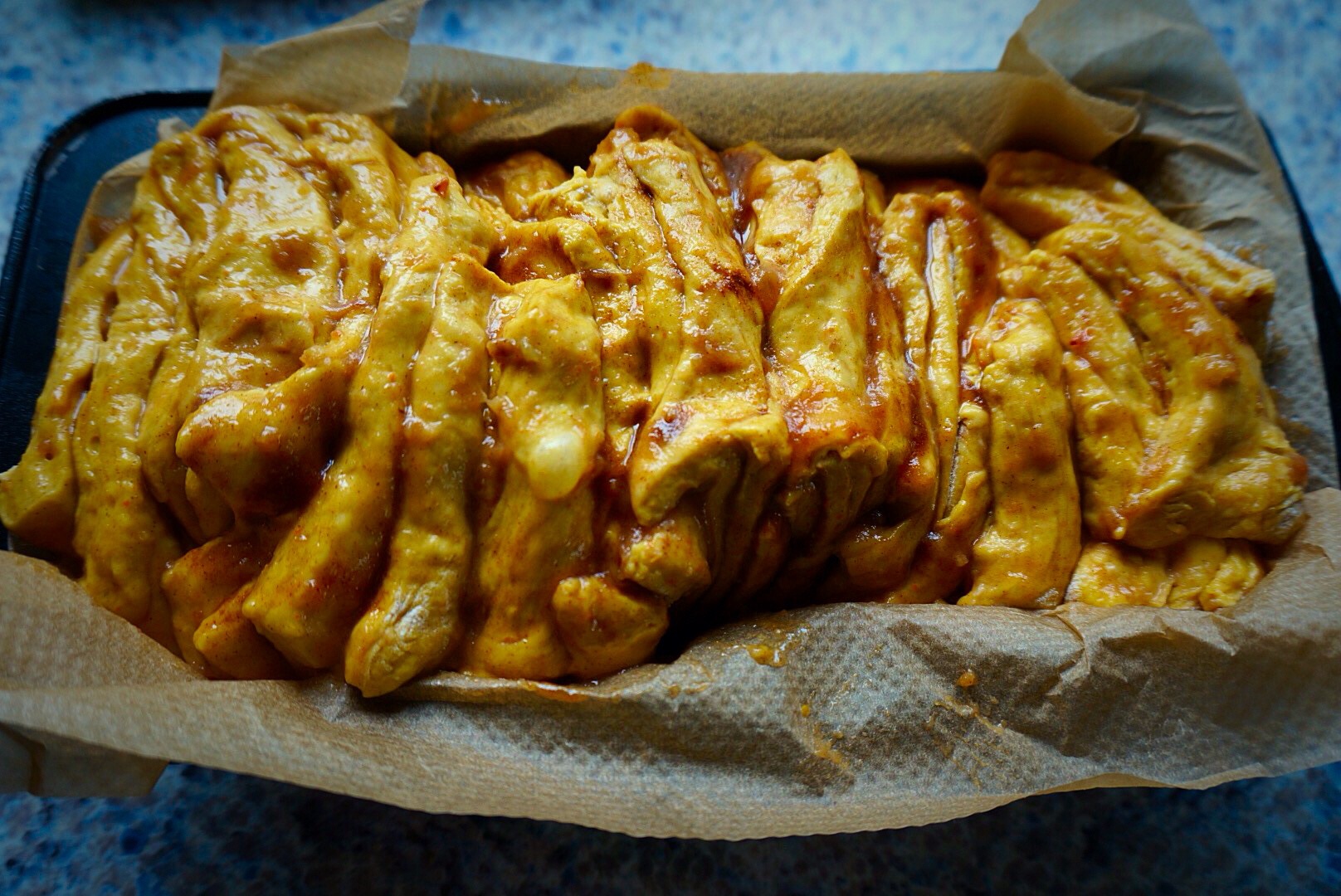 Stack strips vertically into the loaf pan.I like using baking paper inside of the pan.Makes the removing operation hell of an easier, when you do not need to scrape or cut the bread out of the pan.