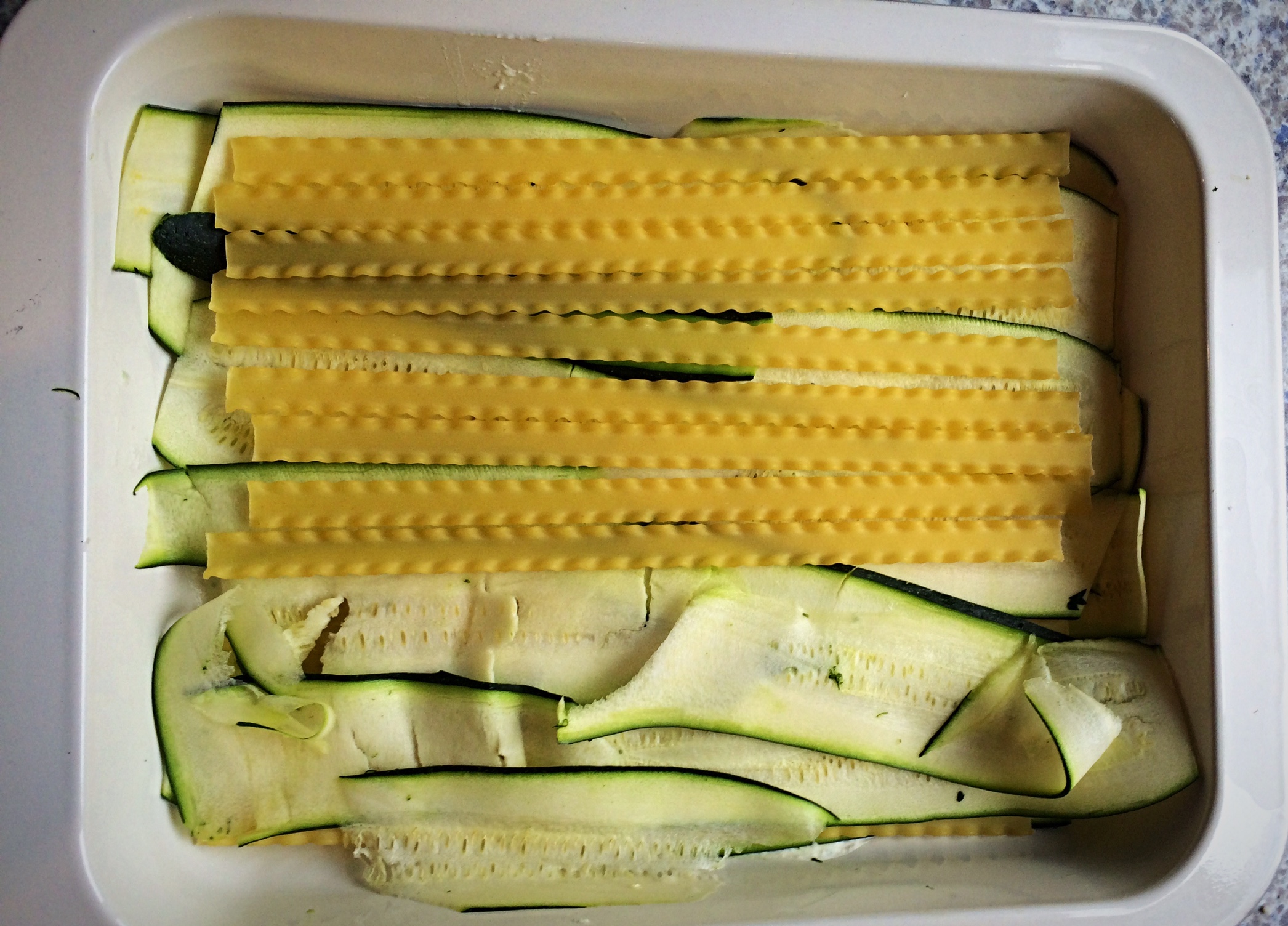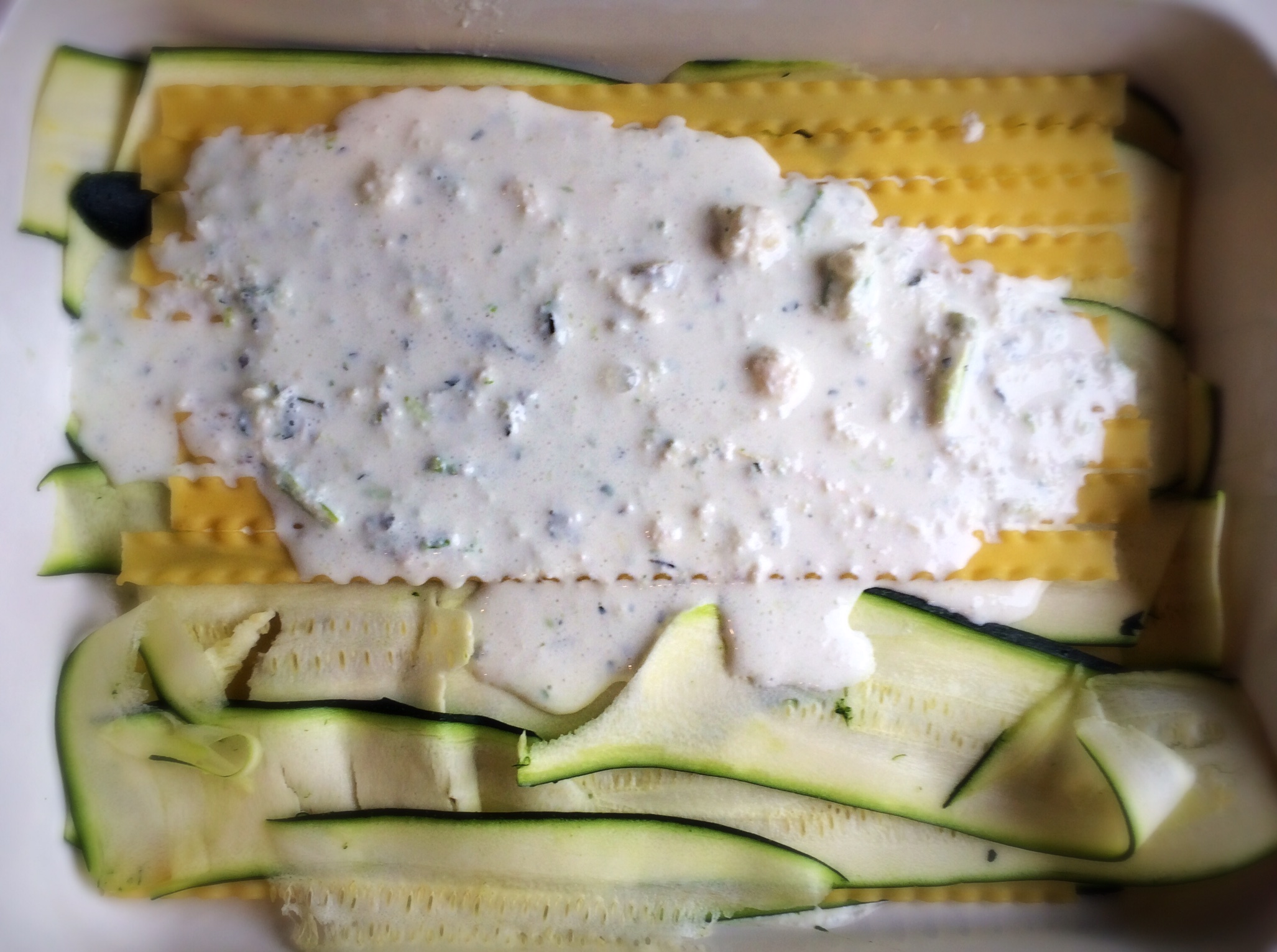 Layer with 3 noodles, cheese mixture,sliced zucchini and one shredded mozzarella cheese.