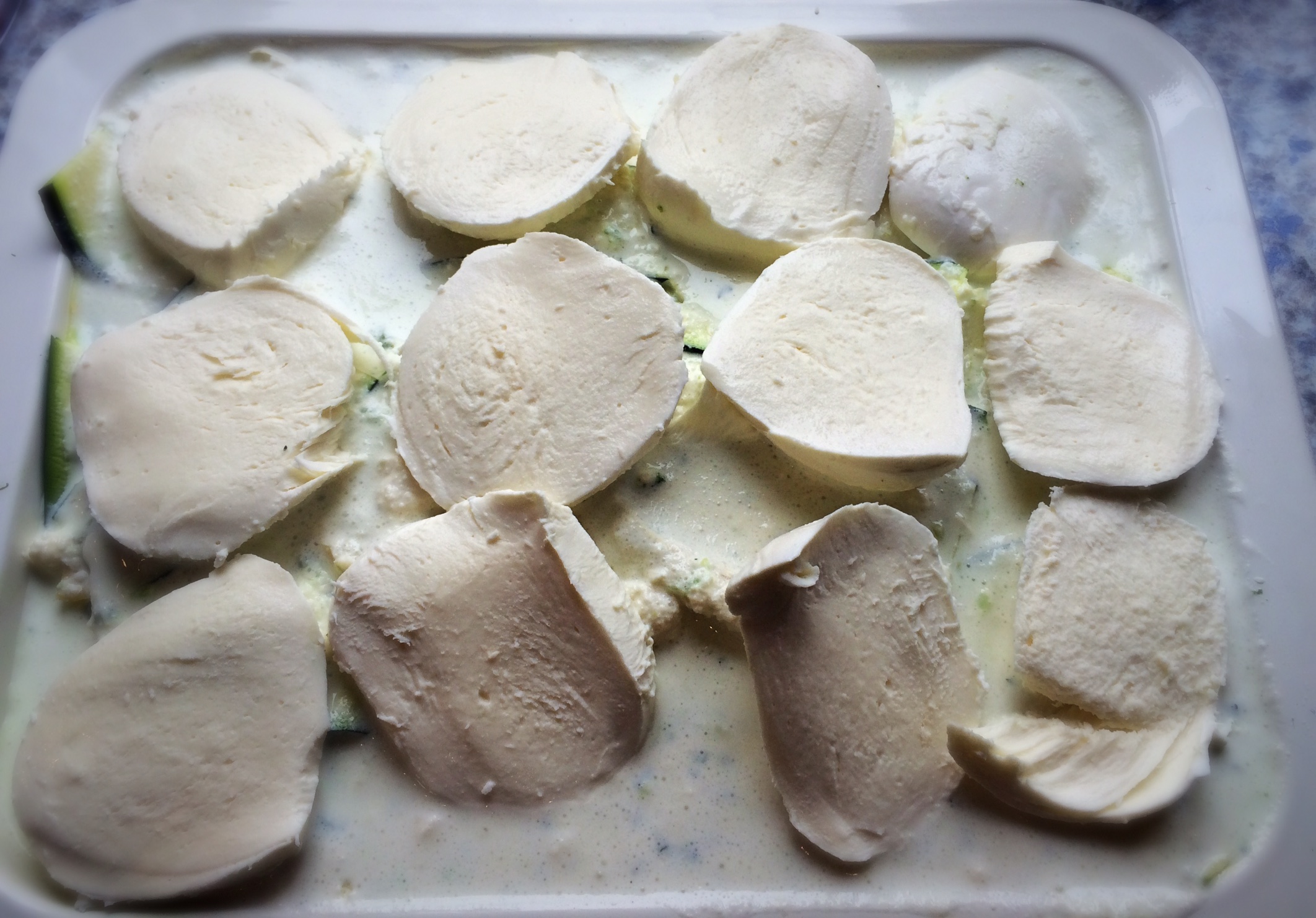 Add two more pasta-zucchini-cheese layers. Top with remaining 3 noodles with zucchini and mozzarella cheese. For topping you will need tree mozzarella balls cut into slices. Any left over sauce you can pour on the top of the casserole.