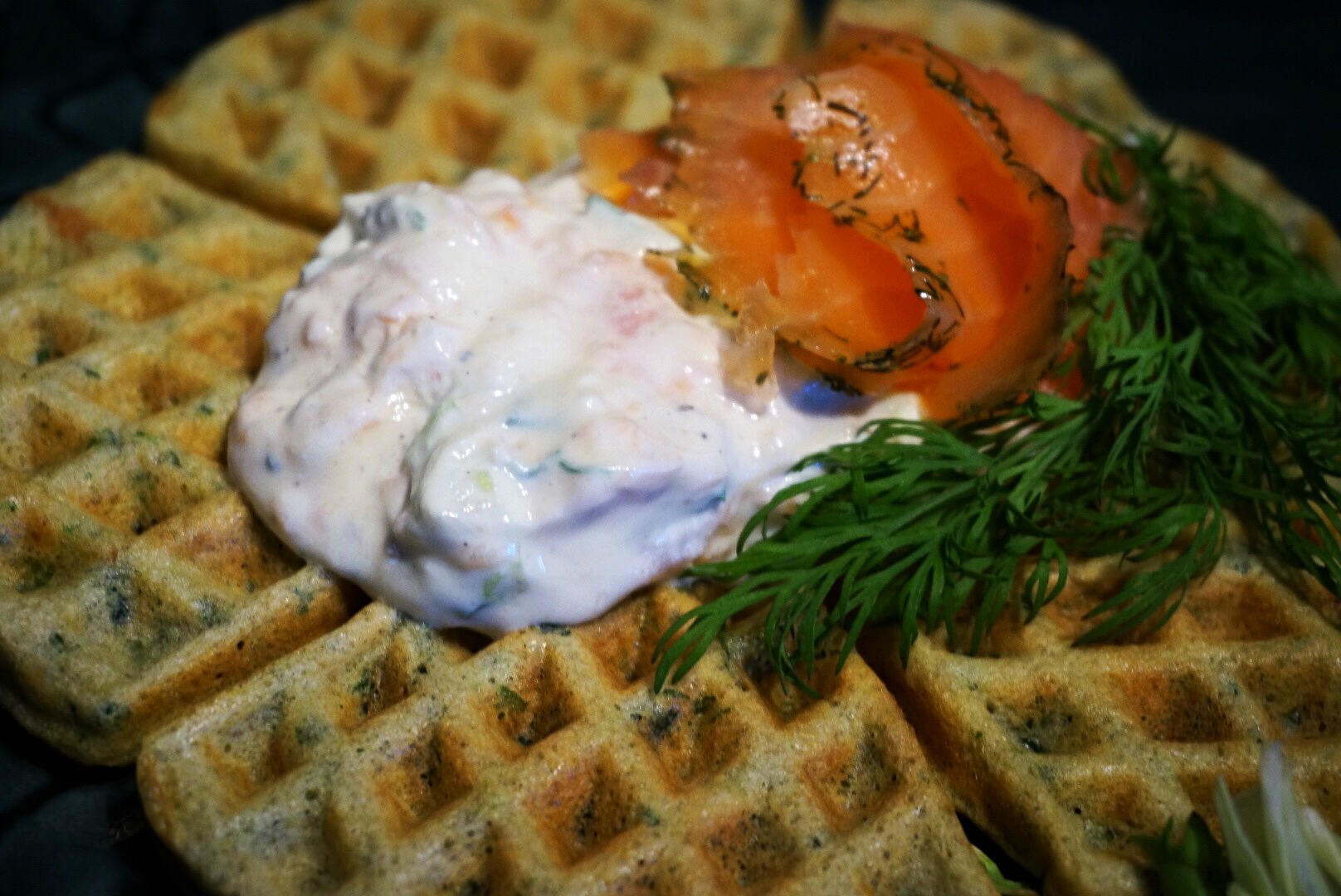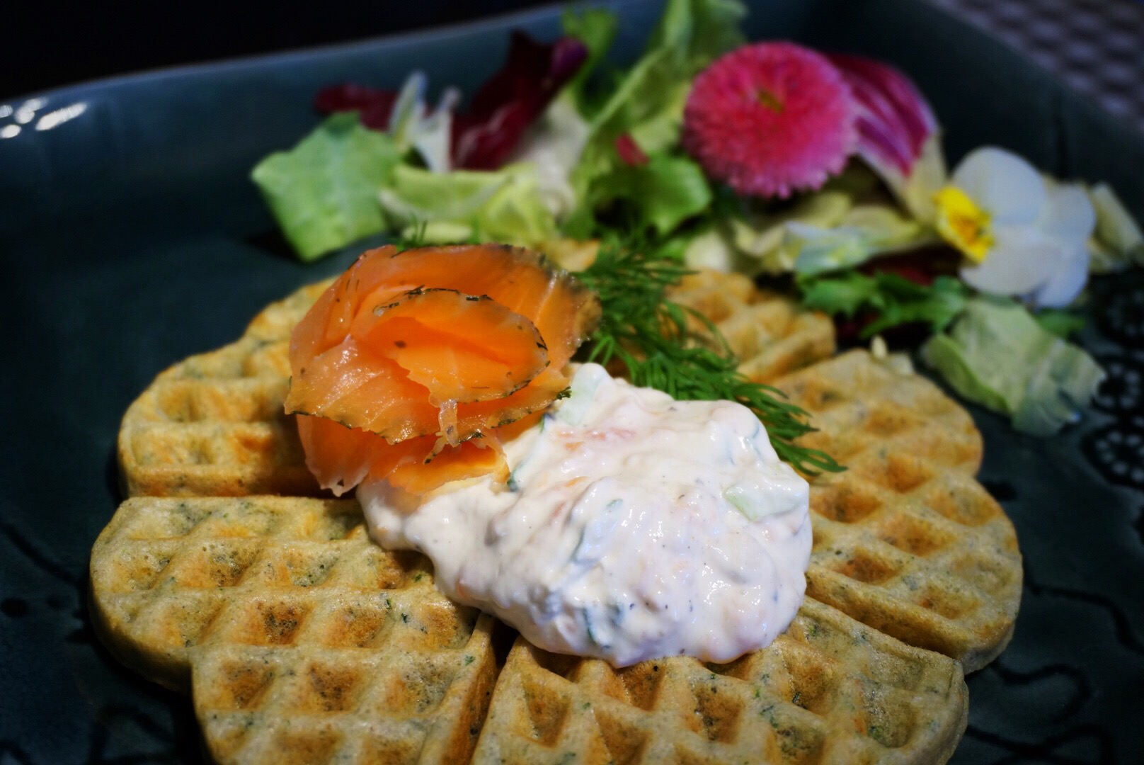 - 200 g cold smoked salmon and some extra for decoration on top of your waffle.