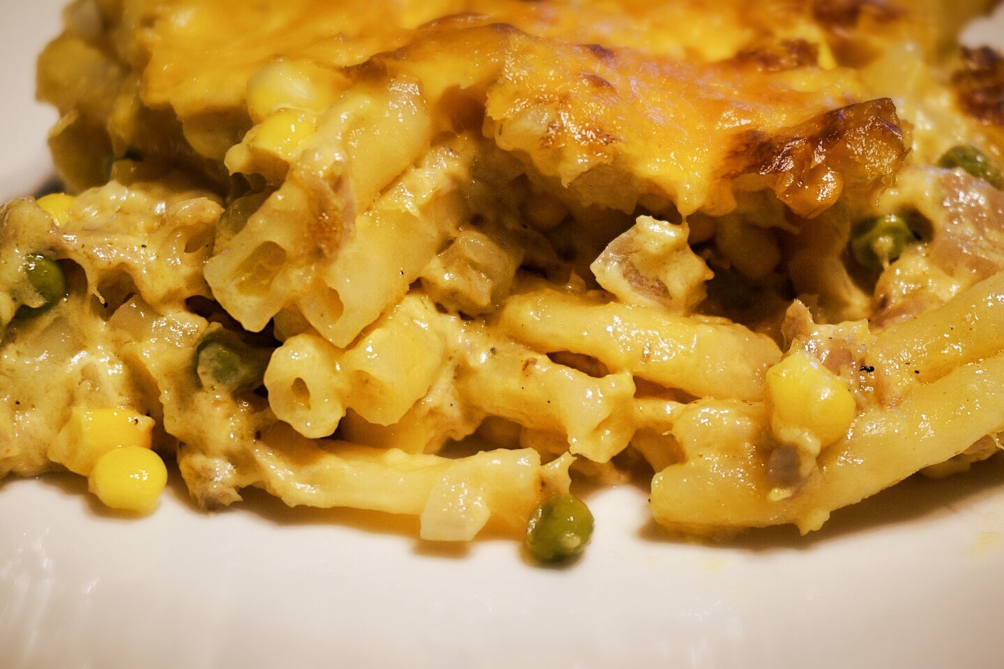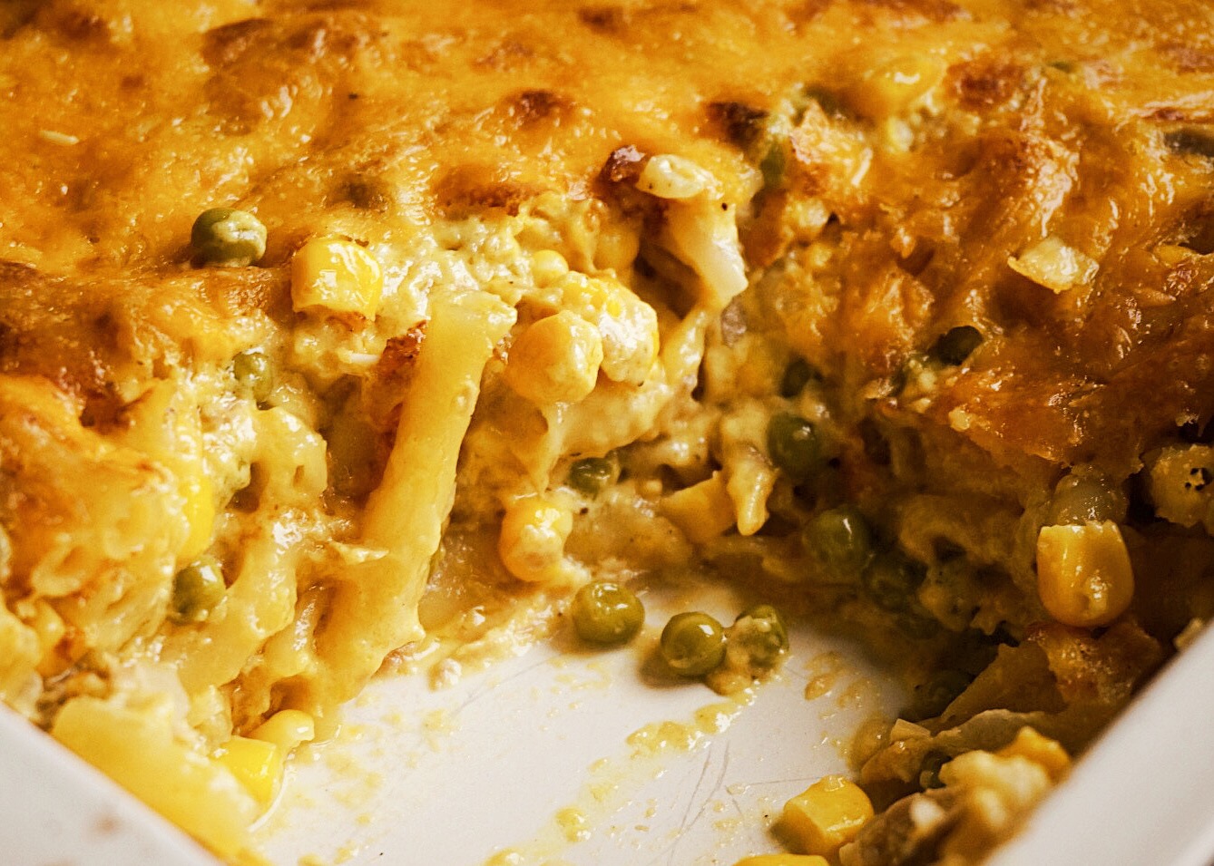 - Add tuna,corn,sweet peas and rest of the spices. Stir and pour in oven form. Top with rest of your crated cheddar.Bake in 180c about half an hour.