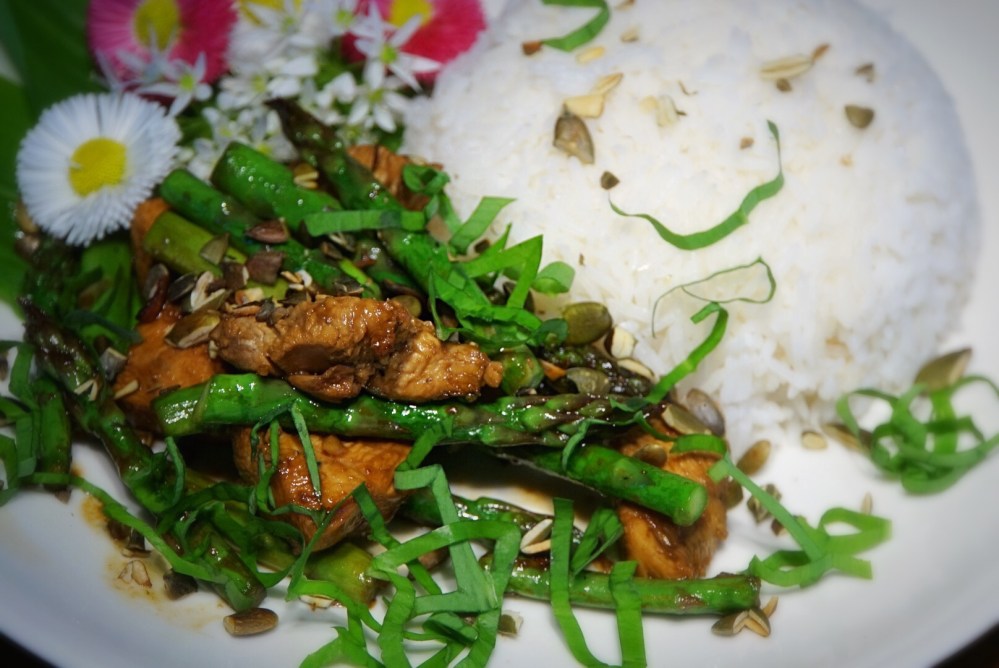 - Before serving add the roasted pumpkin seeds on top your asparagus chicken and top with finely minced wood garlic.
