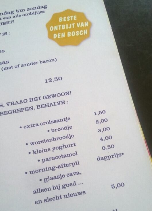 We had lunch in small place in the city called DIT/den Boch. Menu was funnily written. One of the menu items in breakfast menu were pain killers and other day after pills. Price was the price of the day. We didn’t need neither of..