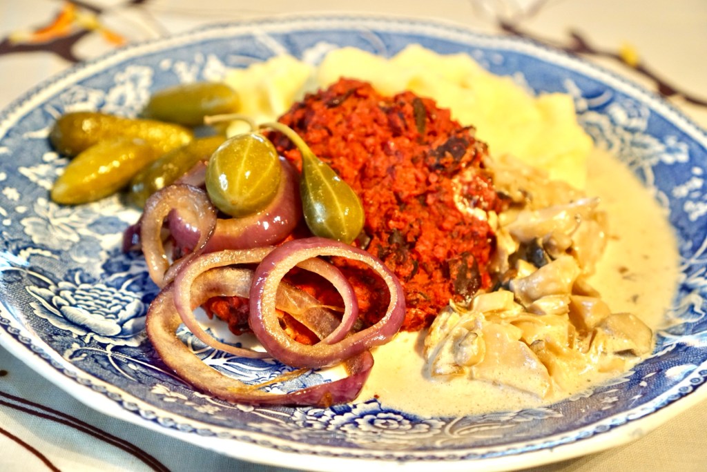 Originally, Biff à la Lindström is a Swedish dish made from onion, potato, red beet, capers, and ground beef, which are made into patties and fried. Although the name Lindström sounds Swedish, the inclusion of beets and capers makes it likely that the dish originates in Russia.