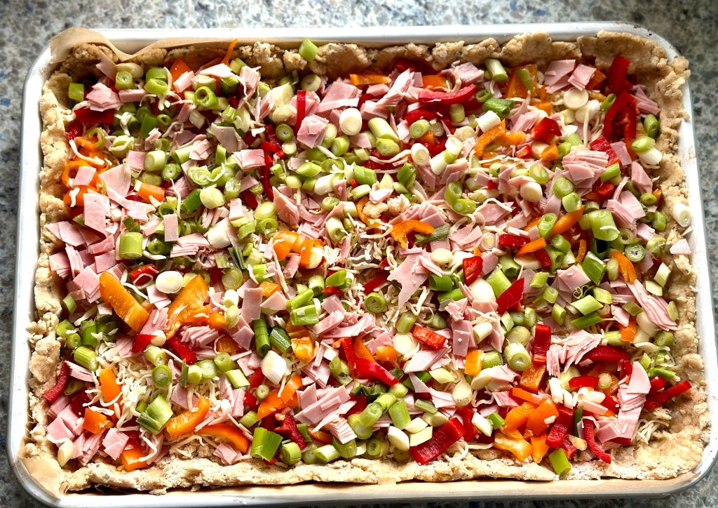 - Spread the vegetable-ham mixture onto the pie crust. Sprinkle grated cheese on top and finally pour the cream mixture over it.