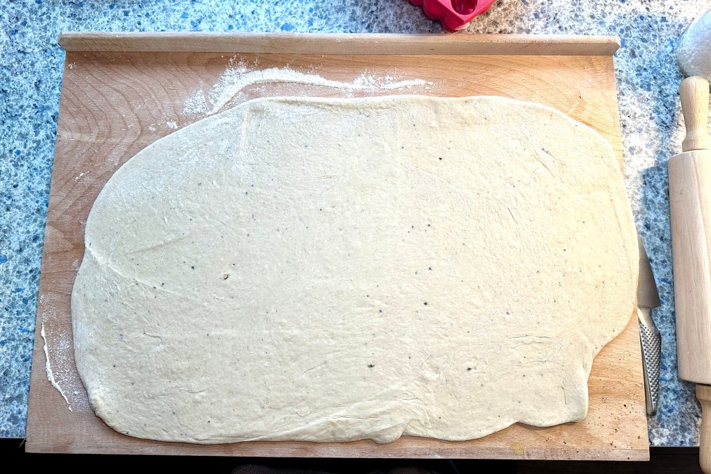 - Roll the dough into a thin sheet using flour as needed (35 x 70 cm). Follow the given measurements to ensure the sheet is thin enough and has enough layers for the rolls.