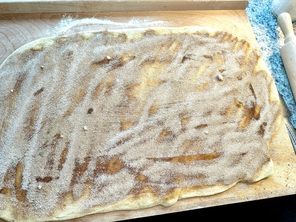 - Mix 2 dl sugar and 4 tbs cinnamon into the softened butter and set aside.
