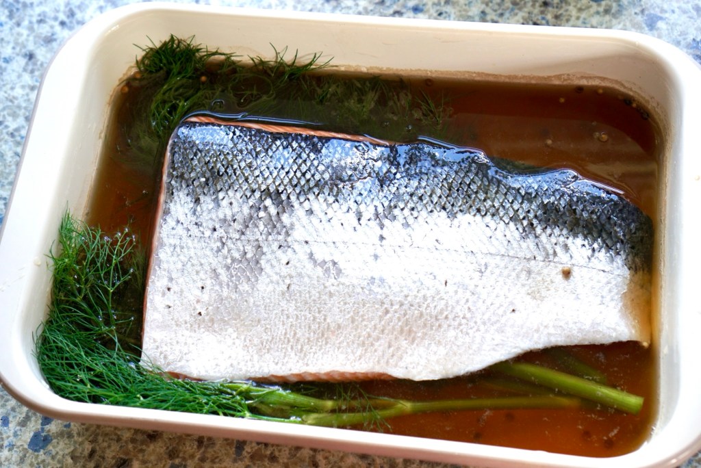 - Place the salmon skin side up in a dish. Pour the cold brine over it. Cover with plastic wrap. Place it in a cool place and let it marinate for a few hours. Turn the salmon skin side down and let it marinate for 24 hours.
