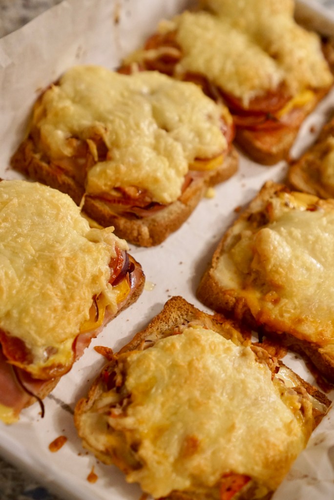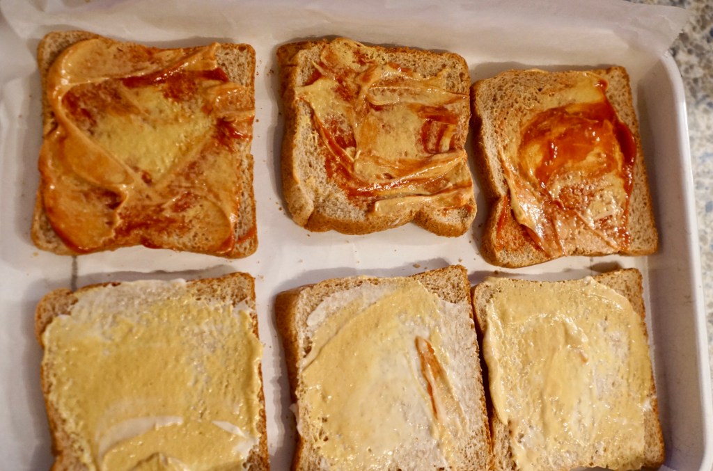 - Spread butter and mustard on the slices of bread. Place the bread on a baking sheet lined with parchment paper.