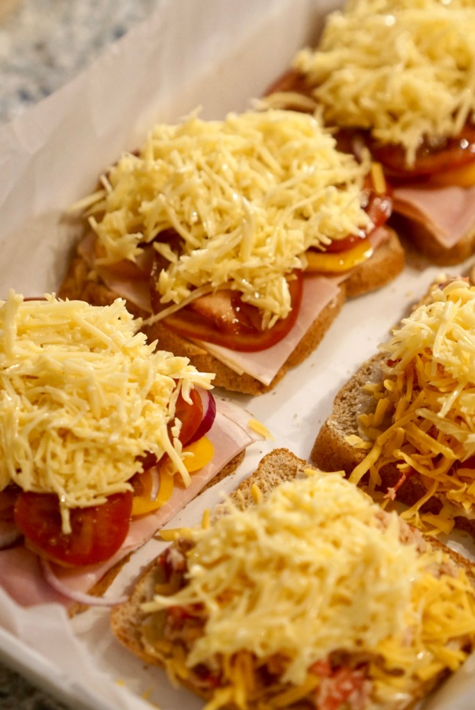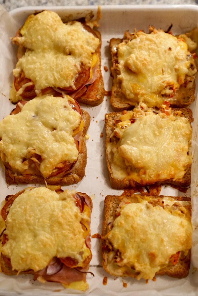 Lämpimät voileivät or lämppärit as this Finnish sandwitch recipe is called in Finnish. So we are talking about open-faced warm sandwiches. This was very popular in the ’80s. I remember we often had these as evening snacks, especially after the sauna on Saturdays. Lämppärit were always served with fresh salad.